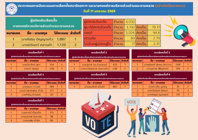 ประกาศผลการนับคะแนนการเลือกตั้งสมาชิกสภาฯ และนายกองค์การบริหารส่วนตำบลมะขามหลวง (อย่างไม่เป็นทางการ) วันที่ 11 มกราคม 2568