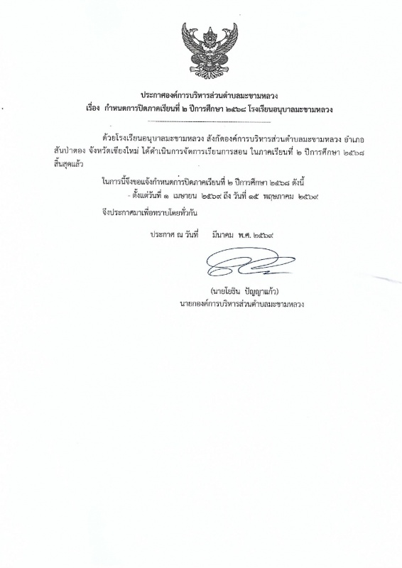 ประกาศปิดภาคเรียนที่ 2 ปีการศึกษา 2568 โรงเรียนอนุบาลมะขามหลวง
