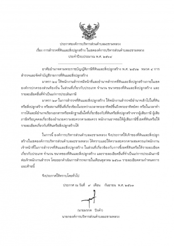 ประกาศการสำรวจที่ดินและสิ่งปลูกสร้างในเขตอบต.มะขามหลวง