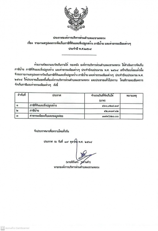 ประกาศ เรื่อง รายงานสรุปผลการจัดเก็บภาษีที่ดินและสิ่งปลูกสร้าง ภาษีป้าย และค่าธรรมเนียมต่าง ประจำปีงบประมาณ 2568