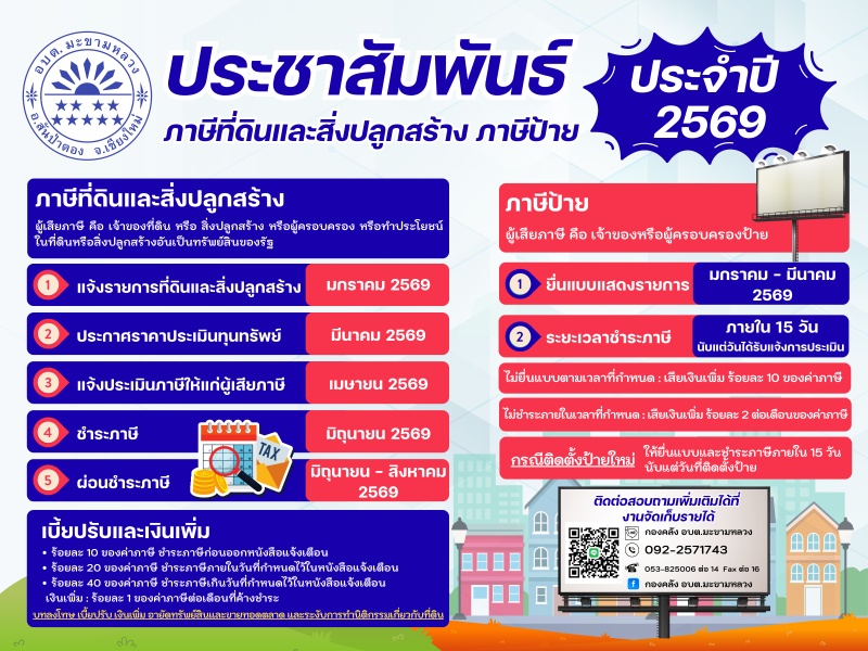 ประชาสัมพันธ์ ภาษีที่ดินและสิ่งปลูกสร้างภาษีป้าย ประจำปีงบประมาณ 2569